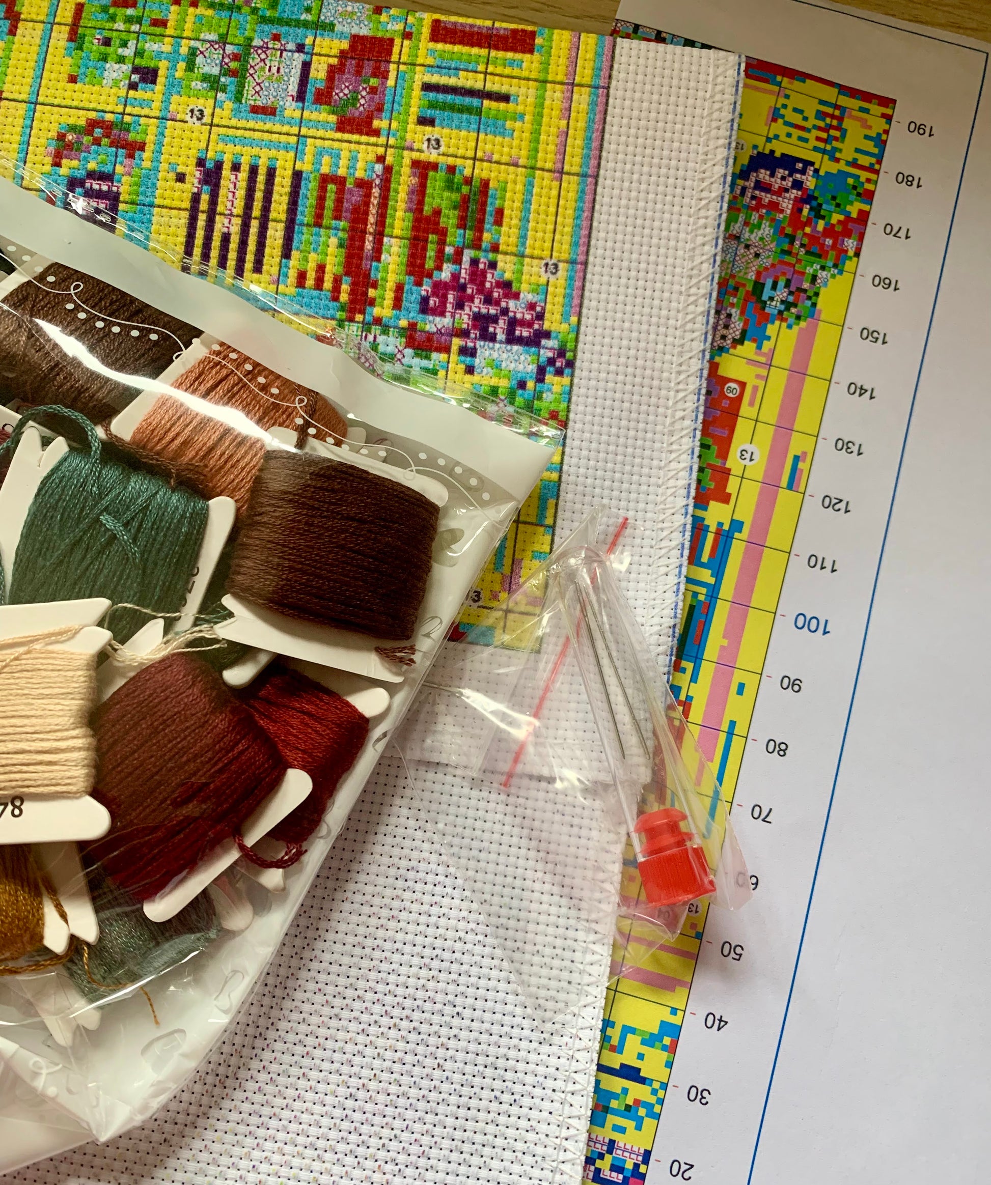Beautiful cross stitch kit of a bookstore storefront. This kit includes all the floss needed, a needle, instructions and printed Aida. You can use the chart to help keep track but having the design printed on the canvas makes it so much easier to follow the pattern. The pattern on the fabric then washes out leaving your work ready to frame.