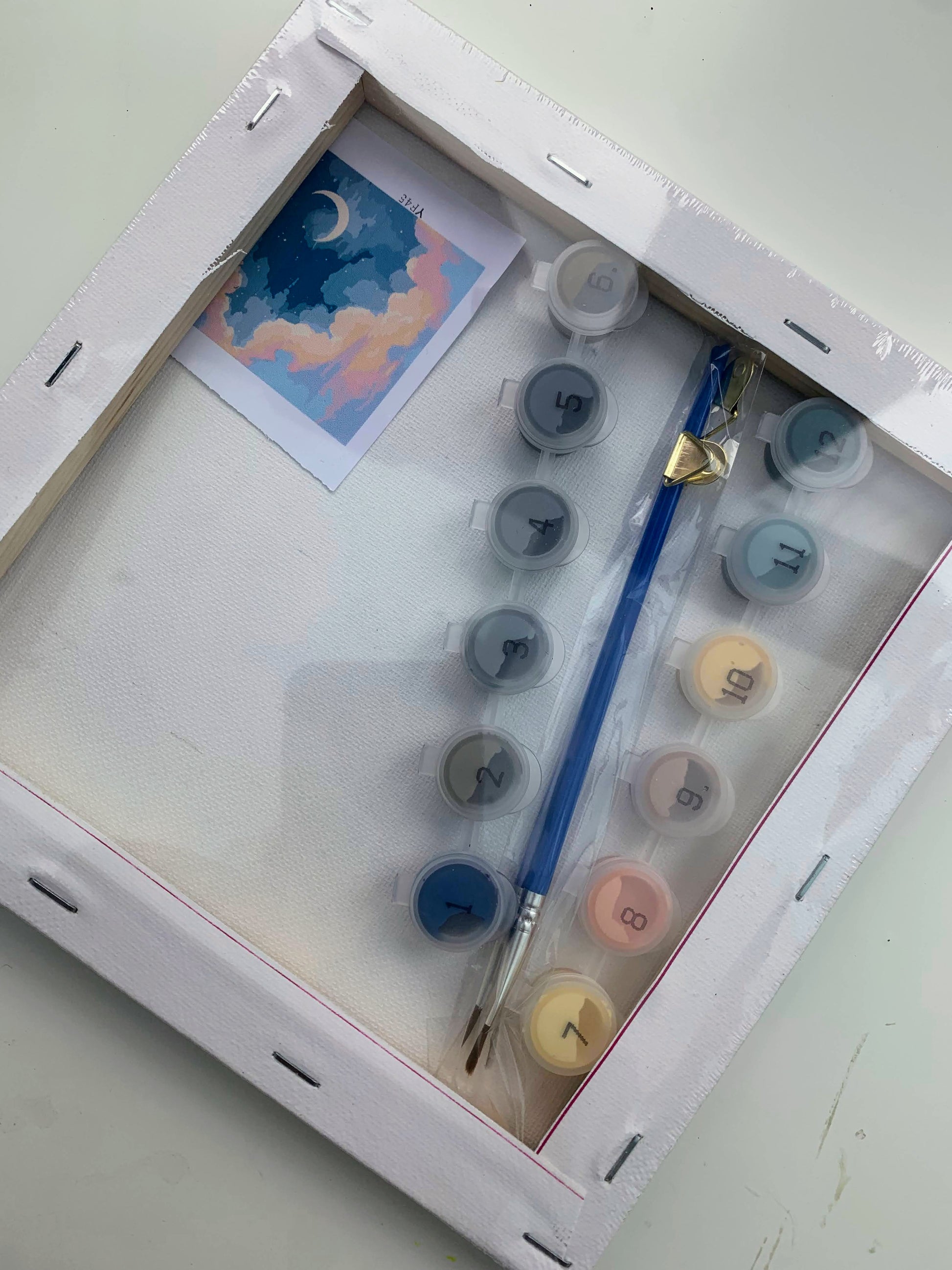 Beautiful night sky at dusk with a moon and clouds paint by number kit. Kit includes canvas, acrylic paint pots, paint brush and hanging grips for the canvas so everything you need to get going.