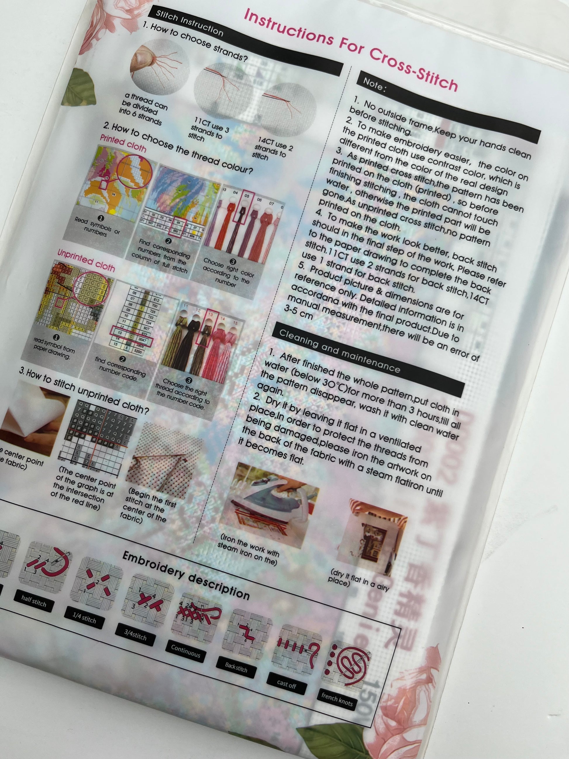 You can use the chart to help keep track but having the design printed on the canvas makes it so much easier to follow the pattern. The pattern on the fabric then washes out leaving your work ready to frame. Instructions for washing are included in the kit. the Aida has also been edged so that it won’t fray.