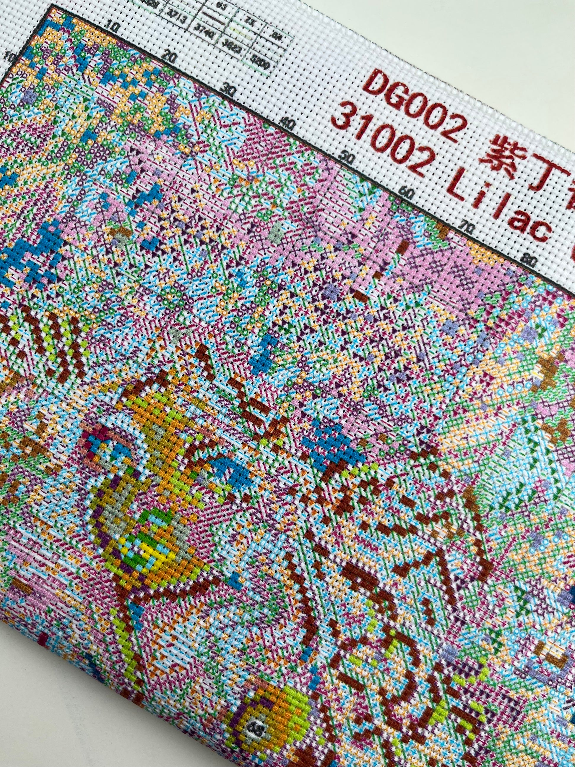 A cute fairy stamped cross stitch kit featuring a fairy amongst lilac flowers holding a lantern. The pattern is edge to edge so the whole picture is stitched.