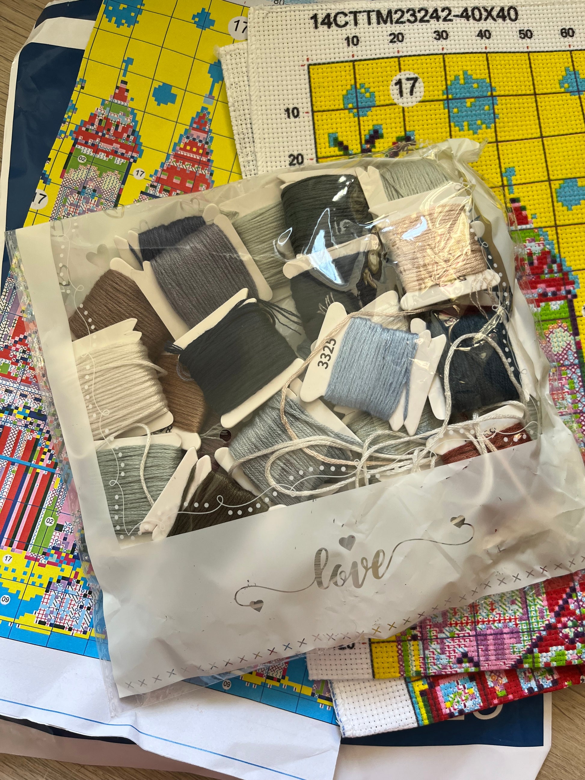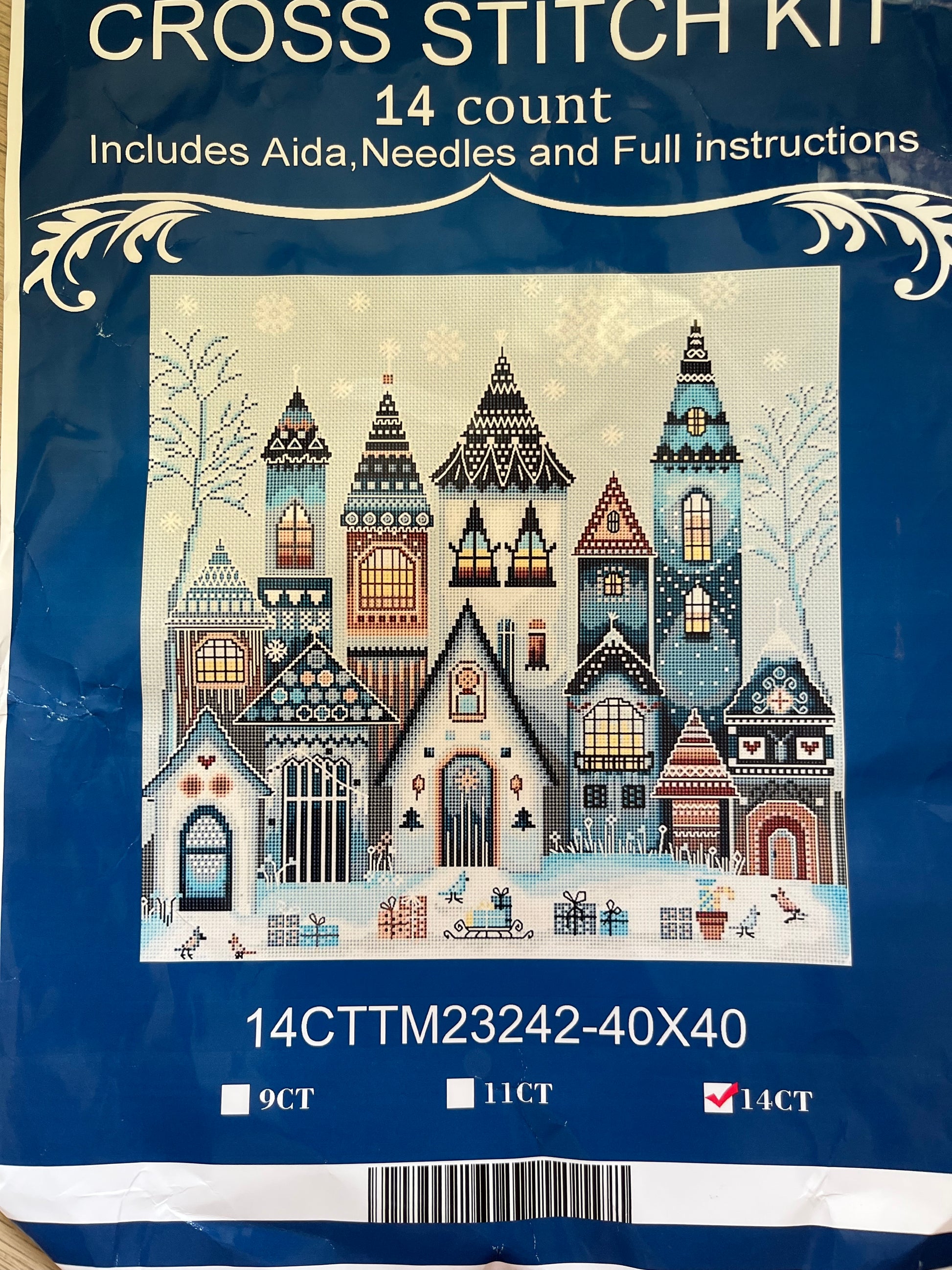 A beautiful Scandinavian style village of tall houses depicted in a cross stitch kit. This kit includes all the floss needed, a needle, instructions and printed Aida.